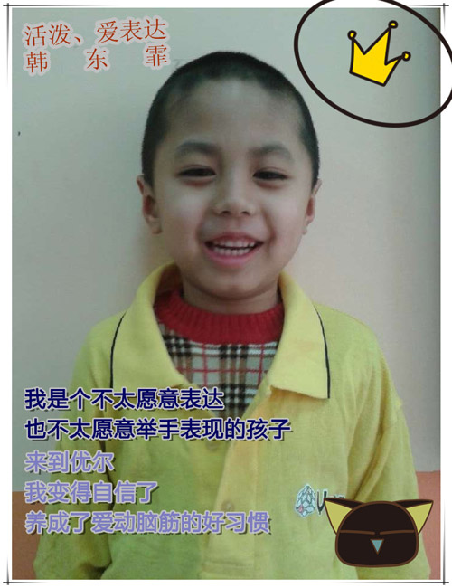 优尔让迪迪找到了自信,而且也养成了爱动脑筋的习惯,希望迪迪能够在优尔的每一天都能够健康快乐的成长,我们会和他一起努力让他的天赋发挥到极致。迪迪,加油!期待你更好的表现!