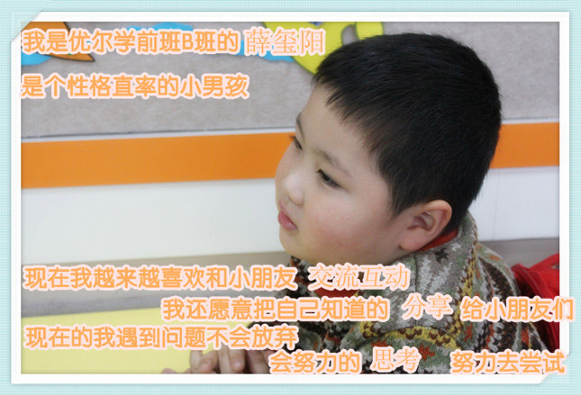 Coco老师:薛玺阳是个性格很直接孩子,之前对其他小朋友的语气不是很柔和,但是经过一段时间的相处,他和小朋友亲近了很多,也愿意把自己知道的知识教给其他的小朋友。不会放弃难题,愿意自己去思考,去找解决的办法。