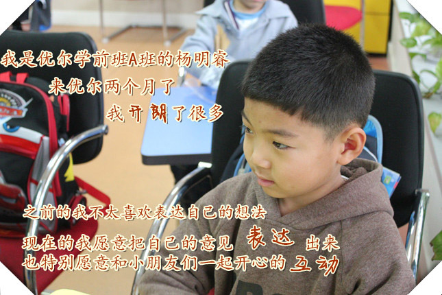 妈妈说:杨明睿时优尔学习思维训练的小学员,家人对优尔的教学理念非常赞同,所以就给孩子送到了优尔学前班,现在孩子的性格开朗了,专注力也有进步。