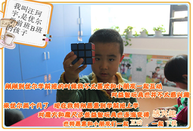 Coco老师:刚到优尔学前班的汪珂宇很乖,胆子很小希望老师都能喜欢他,并帮助他,不爱喜动脑筋,遇到困难的时候会哭,不会去想解决的方法,现在汪珂宇遇到问题的时候会自己想考,自己想办法,也变得坚强了,还能把自己学会的教给其他小朋友,老师希望汪珂宇能再多和小朋友沟通交流。